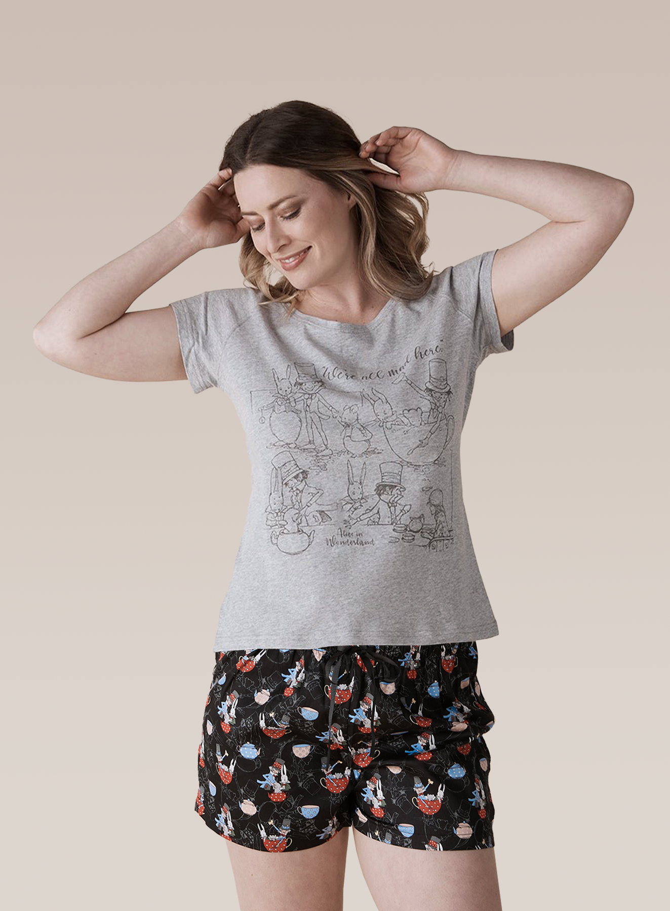 Bring a touch of whimsy to your summer sleepwear collection with the We're All Mad Here Tee and Pyjama Shorts Set, inspired by the magical world of Alice in Wonderland.